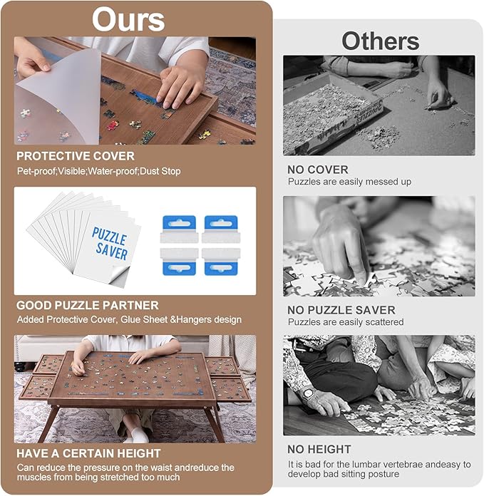 - 【4 Drawers and Puzzle Cover】4 Drawers provide extra surface space to work on which you can keep the pieces organized in the drawers instead of on the board itself, making it easier to see the big picture. Protective Cover helps a lot in organizing pieces and are easily able to put an unfinished puzzle away anytime