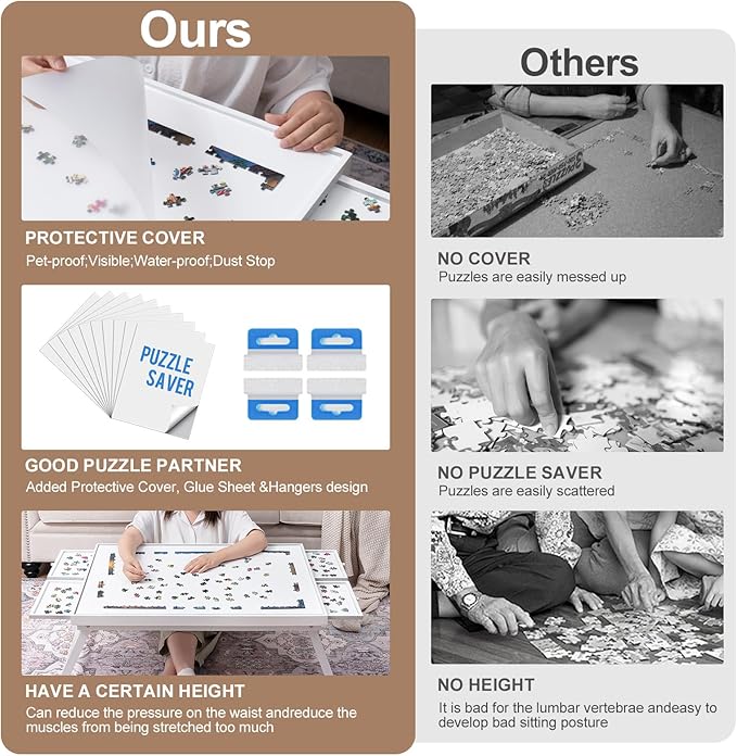 - 【4 Drawers and Puzzle Cover】4 Drawers provide extra surface space to work on which you can keep the pieces organized in the drawers instead of on the board itself, making it easier to see the big picture. Protective Cover helps a lot in organizing pieces and are easily able to put an unfinished puzzle away anytime