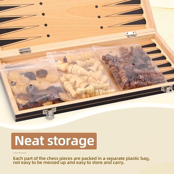 - 【THREE-IN-ONE DESIGN】enjoying the fun of having chess, checkers and backgammon in one set. With 24 checkers, 2 dices and 34 chess pieces, including 2 extra Queens. Stay away from mobile phones and computers, allowing the brain to exercise and relax.