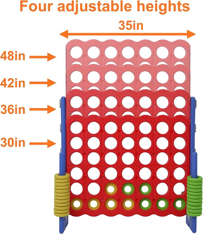 - 【Upgraded Model】: Height adjustable giant four connect in a row game encourage socializing, problem solving, matching, strategizing, focus, hand-eye coordination skills with the interactive as kids work together to win,perfect for playing with partner.