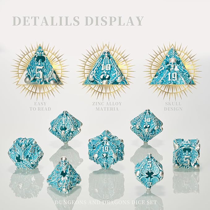 DND Metal Dice Set - Matte Blue White 7 PCS Skull Hollow for Dungeons and Dragons, MTG RPG Role Playing (D&D)