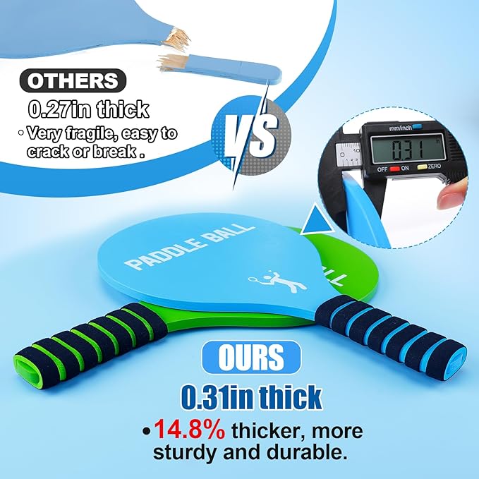 - High-quality Material: Our paddles are crafted from 0.31in thick poplar wood, and offer unmatched elasticity, ensuring hours of fun-filled gameplay without worrying about wear and tear. There are non-slip foams on the handles to provide a comfortable holding experience. The balls are made of PVC and are thick and durable. The birdies are made from three feathers and a rubber sole, which allows them to be played on windy days, and the rubber sole allows them to bounce high for added gameplay fun.