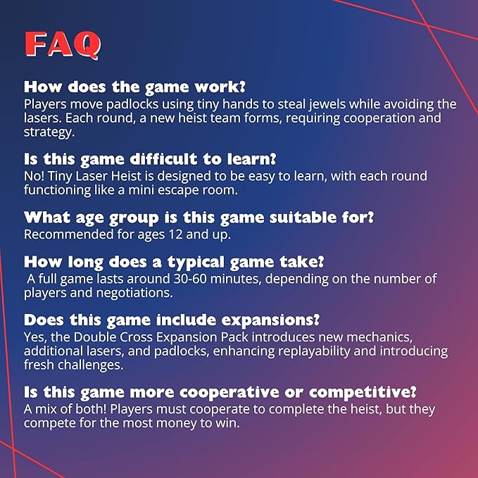 - Quick to Set Up, Impossible to Predict: For 3-6 players, ages 12+, with a fast 5-minute setup and 30-45 minutes of pure chaos. Each round gets trickier as more lasers and padlocks are added. One minute you’re a strategy board game pro, the next you’re wearing an eye patch because someone played a sabotage card. Stay sharp.