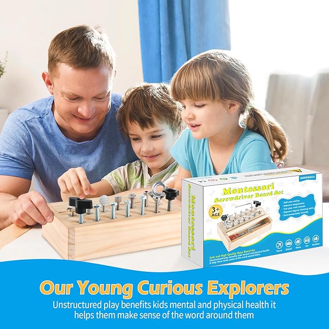 - Montessori Busy Board: Our INIFEIDALA Montessori Screwdriver Board Set is designed to turn a boring learning process into a creative and fun one. This toy for toddlers aged 3+ will help toddlers have fun and confidence while learning to use a screwdriver and while playing. It also helps to push toddlers to explore and solve problems. It also trains hand-eye coordination and develops their fine motor skills
