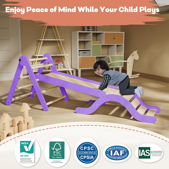 Pikler Triangle Set 7in1 Toddler Climbing Toys Indoor Foldable Baby Climbing Toys Wooden Montessori Climbing Set with Arch, Ramp, Ladder for 1-3 Years, Jungle Gym for Kids (Purple)