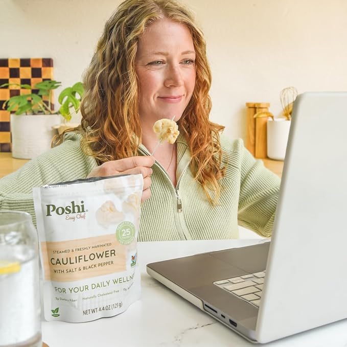 POSHI Marinated Cauliflower Florets with Salt + Black Pepper Natural, Keto, Vegan, Non GMO, Low Carb + Calorie, Gluten Free Ready to Eat Fully Cooked Vegetables, Pentry Food, Gourmet, 6 Pack, 4.4 oz