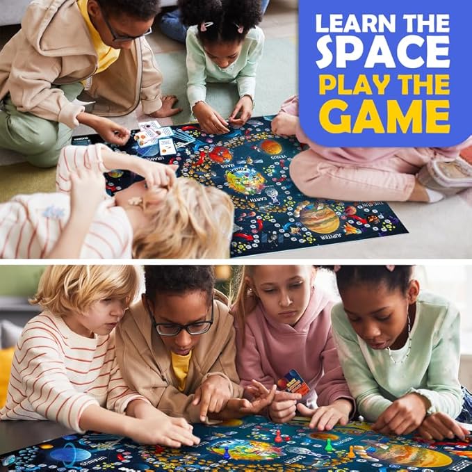 - HUGE SPACE MAP GAME: In this race you have a chance to check your luck & basic knowledge of the world; Board game size 47"x 28" with 100 educational question cards; Move your pawn through the space map while overcoming obstacles with correct answers