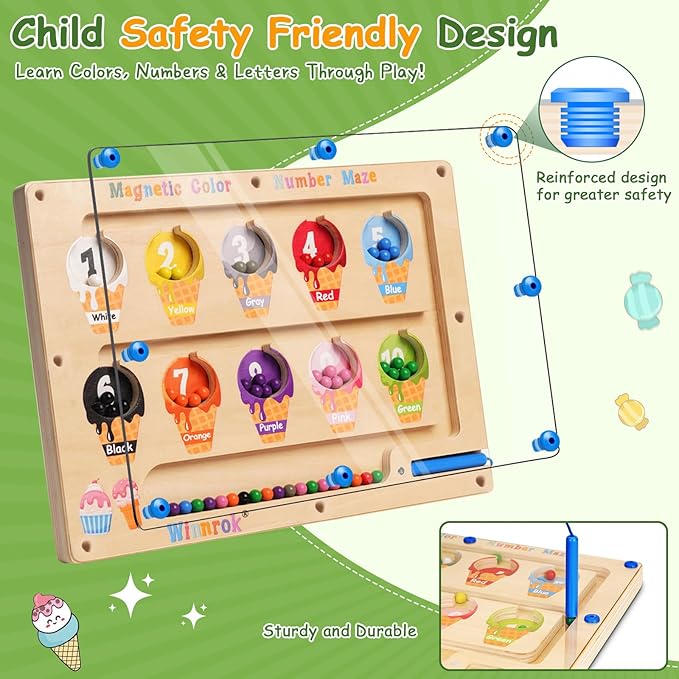 • Safe & Child-Friendly Design: This magnetic maze for kids ages 3-5 is made of extra-thick natural wood with non-toxic paints, specially treated smooth rounded edge corners, and a smooth acrylic surface to ensure your child won't scratch. The magnetic number and color maze broad surface is secured with 8 pins to ensure that the beads will not fall out and be swallowed by your child by mistake! The magnetic pen has appropriate magnetic power attached to the board and beads, which is easy to store and the beads have enough suction to be adsorbed