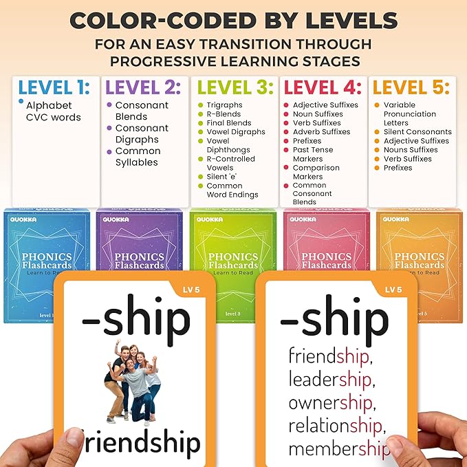 - JUMBO SIZED CARDS WITH PICTURES: Cards measure 4.5x3.5 inches, featuring vibrant illustrations for better engagement; color-coded by level for easy progression; ideal for reading tools for kids ages 6-8 and phonics games for kids ages 3-5
