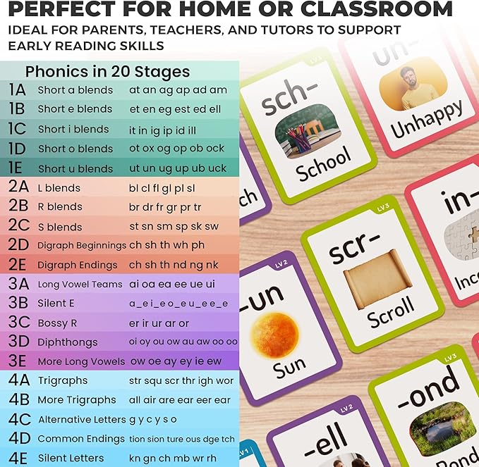 - 20 COMPLETE PHONIC STAGES | 260 CARDS: Boost reading fluency through 20 comprehensive stages; progress from alphabet and simple CVC words to advanced suffixes and prefixes, blends and more; designed for kids ages 4-8 to learn step-by-step