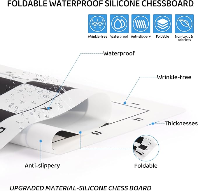- Exquisite Craftsmanship: Our chess pieces are beautifully crafted with a smooth surface and felt pads to reduce friction. The board is made with high-quality silicone for durability and easy storag