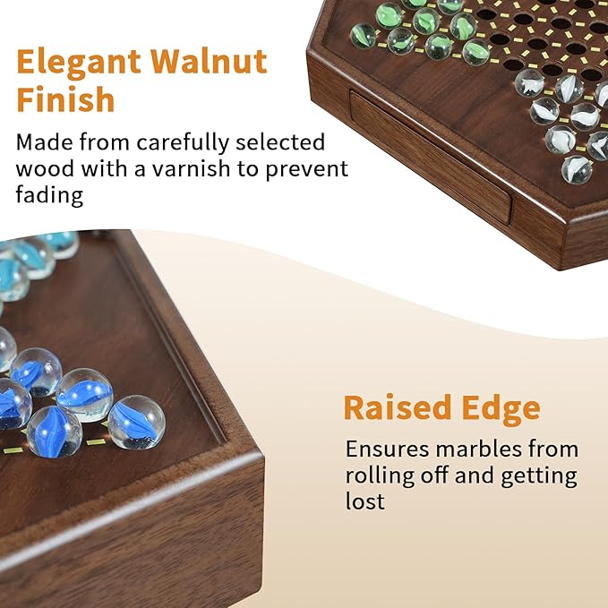 - BUILT TO LAST: Our Chinese Checkers set is crafted from carefully chosen wood with a beautiful walnut finish, safeguarded by varnish to maintain its color over time. The raised edge of the Chinese checkers board game is designed to ensure marbles stay on the board and aren’t lost during play