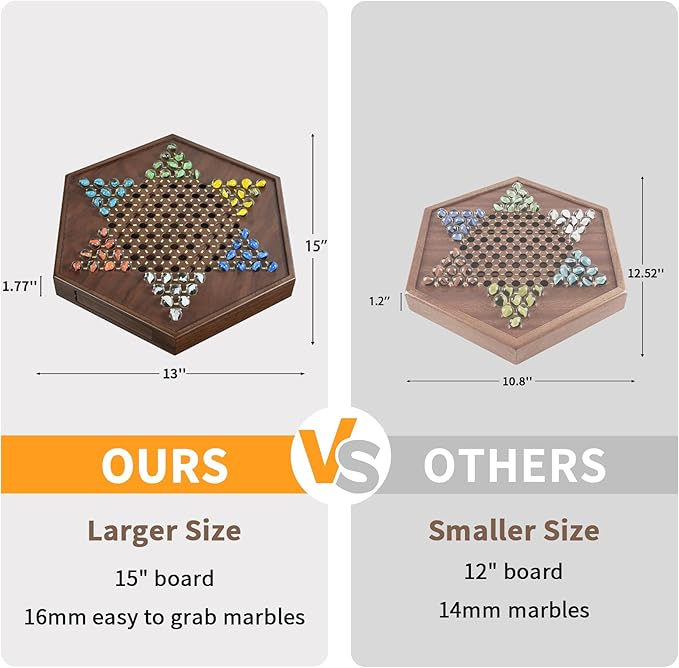 - LARGER BOARD: Step up your game with our larger Chinese checkers board, measuring a generous 15" x 13" x 1.77". The Chinese board games provide plenty of space for all players, complete with 16mm marbles that fit comfortably in your hand. Each marble securely nestles into a hole sized just right for stability throughout the game