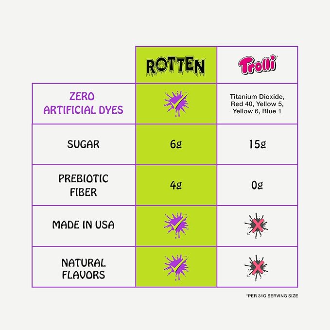 - Freakishly Delicious: Rotten scientists spent 3 years perfecting our Original and Sour Natural Gummy Worms so you can enjoy better candy without sacrificing taste. Six Festering Flavors—Loopy Lime, Messy Mandarin, Scary Cherry, and more. Gluten-free!