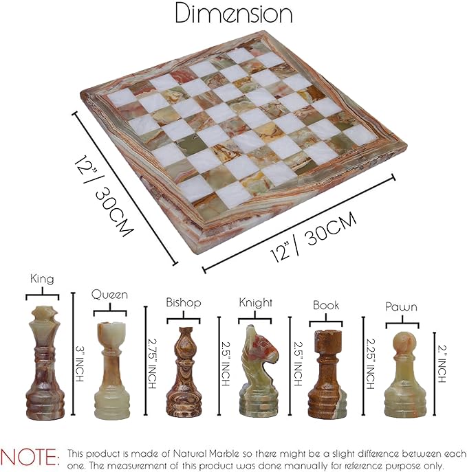 - ๐ Perfect Size: With a chess board set size of 12 inches, this luxury chess set is designed for enjoyable play. The King measures 3.5 inches, Queen 2.5 inches, and other pieces crafted in perfect proportions.