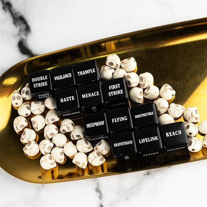 - Package Include: Total 24pcs shield dice counters(12pcs 1~6 dice&12pcs 7~12 dice) and 24pcs black MTG keywords dice(FIRST STRIKE,VIGILANCE,MENACE,TRAMPLE,HASTE,DOUBLE STRIKE / LIFELINK,REACH,FLYING,HEXPROOF,DEATHTOUCH,INDESTRUCTIBLE) with velvet pouch.