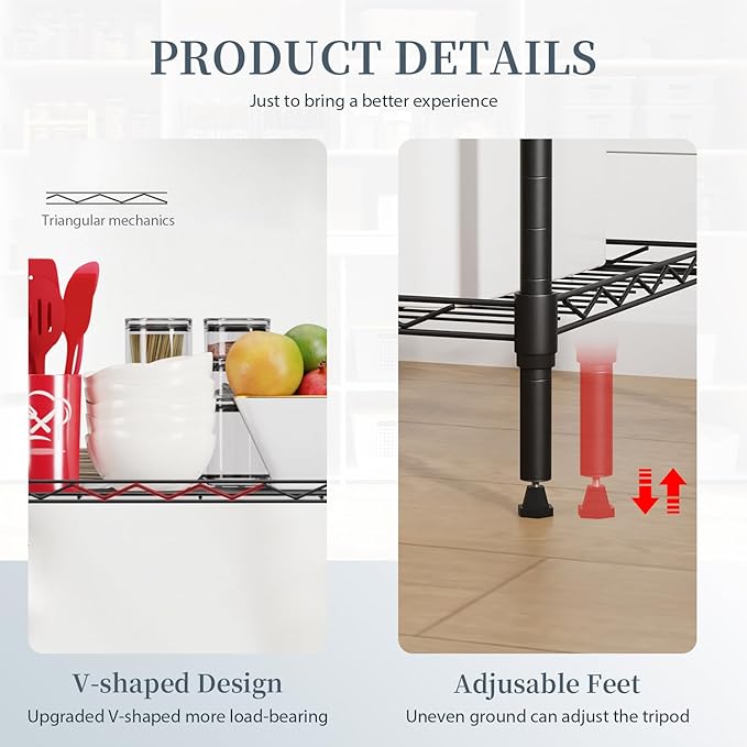 - Durable Frame: Crafted from high-quality v-shaped steel wire, this storage shelf is designed for durability and long-lasting use. The rust-proof and scratch-resistant finish ensures it remains in excellent condition even with regular use. Our shelving unit is built to withstand the demands of any environment, from kitchens to garages.