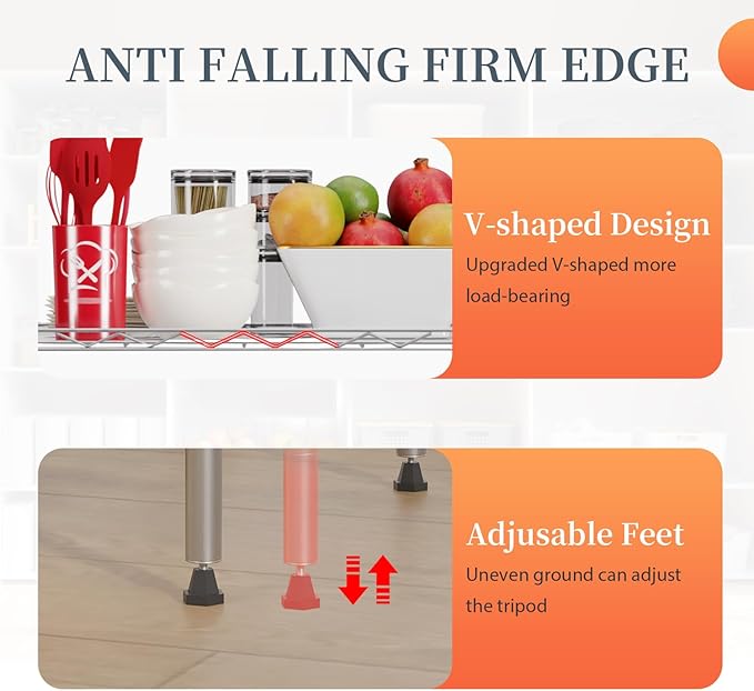 - Durable construction: Crafted from high-quality v-shaped steel wire, this storage shelf is designed for durability and long-lasting use. The rust-proof and scratch-resistant finish ensures it remains in excellent condition even with regular use. Our shelving unit is built to withstand the demands of any environment, from kitchens to garages.