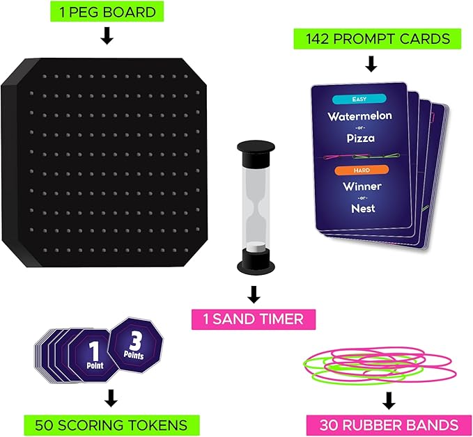 - Quick and Easy Setup: The game includes 1 peg board, 1 sand timer, 30 rubber bands, and 50 scoring tokens. Place the card deck and supplies within reach, and you’re ready for a fast-paced game night full of creativity and excitement.
