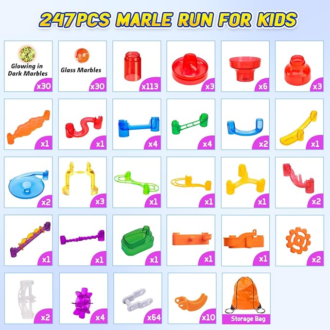 - Motorized Elevator and Glowing In the Dark Marbles Inside: Meland 2024-2025 NEW Launched 247pcs Elevator Marble Run Set comes with 30pcs glass marbles and 30pcs special pattern marbles that glow in the dark! All the marble building pieces are interchangeable so kids can create endless models. The booklet can guide toddlers through the building process step by step, so little ones can build whatever their skill level.