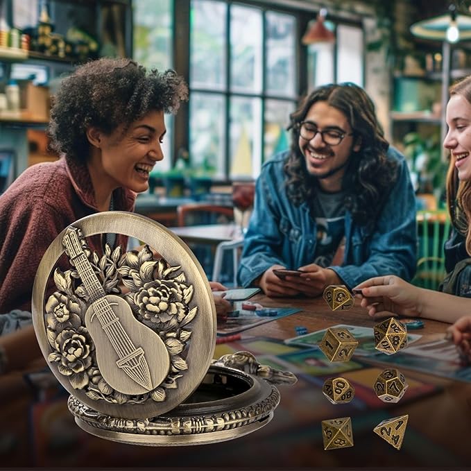 Bronze Mini DND Dice Set with Hollow Bard Pocket Watch Shell Case, Steampunk DND Gifts with Dice Bag, 7pcs Polyhedral Metal Dice Set, D&D Starter Set, Role Playing Board Games Accessories, Bard Gift