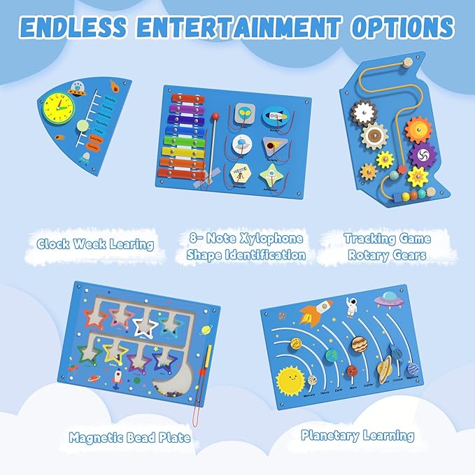 - MONTESSORI WALL SENSORY BOARD: Follows Montessori principles to help kids develop motor skills, hand-eye coordination, language, recognition, spatial understanding, counting, and musical awareness, enhancing social, cognitive, and emotional skills
