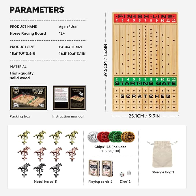 - Complete Accessories: Chessboard, 11 metal horses, 143 chips, 2 pokes, 2 dice, and storage bags. We have prepared all the entertainment accessories you can think of, allowing you to enjoy the fun of the game to the fullest! There is also a clear rule manual, even for friends who are new to it, they can easily get started and quickly activate the Happy Game mode. The size of the chessboard is 15.6*9.9*0.6inch.