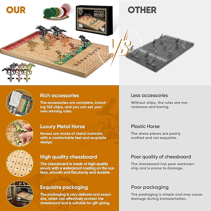 - High Quality Chessboard: The horse racing game is made of high-quality wood and coated with a waterproof layer on the surface, which is smooth, flat, sturdy and durable. The chess pieces are placed stably and not easy to slide. The chess pieces are made of metal material, with a comfortable feel and exquisite design. The entire set embodies high-quality production techniques, providing players with a good gaming experience and visual enjoyment.