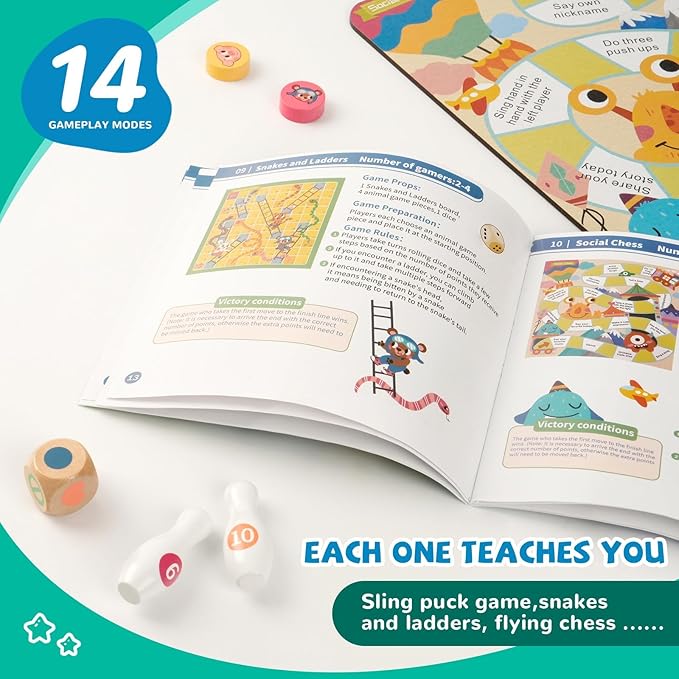 - All-in-one family board games: Experience endless fun with our 14-in-1 Wood Board Games Set. It features a mini bowling game, snakes and ladders, sling puck game, gobang, Gomoku, flying chess, jungle chess and more. There are many more surprises for you to discover