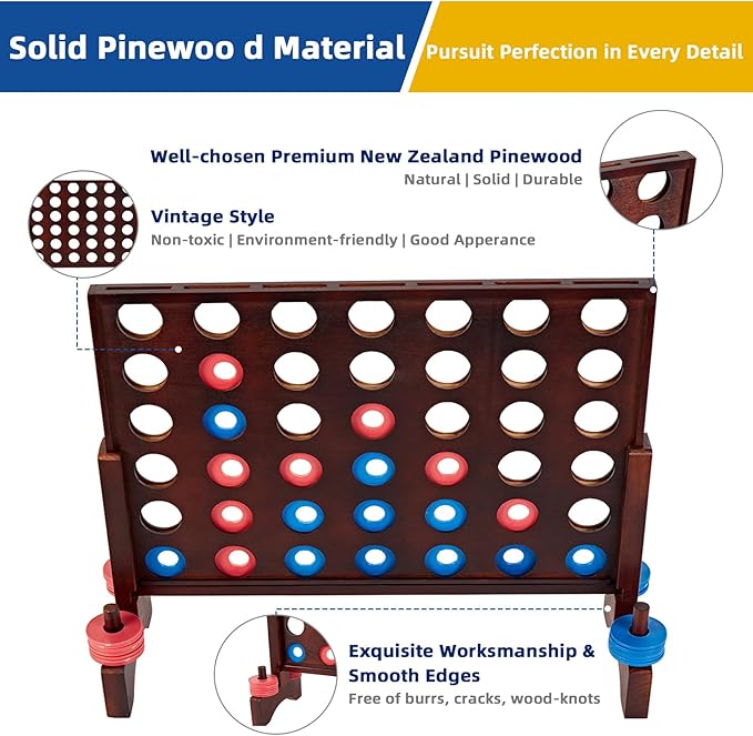 - Premium Materials: Our wooden four connect game set made of premium solid New Zealand Pine Wood.which can ensure not to crack, twist, or warp,The chips are colourful and made of heavy duty polypropylene (PP Plastic), which will not broke when playing.Built in Chips Holders in the well-finished legs for you to store chips and save the space