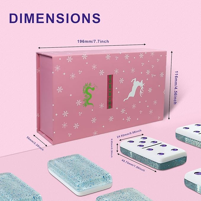 - [PRODUCT DETAILS] : Domino set of 28 pieces, is a classic acrylic board games domino, Excellent quality and reasonable price. And matched With Gift Box and 7 Polyhedral Dice, Each domino size: 1.95*0.98*38 inches ( 28pcs domino wooden box 7.7*4.56*2.2 inches ).