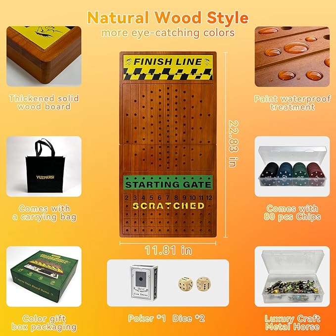 - [Deluxe 23-Inch Wooden Horse Racing Board Game] Crafted from high-quality wood, this large horse racing board game features a double-layered color spray finish that is waterproof and corrosion-resistant. Enjoy a smoother playing surface while indulging in your love for horse racing with the 80 included poker chips during derby parties
