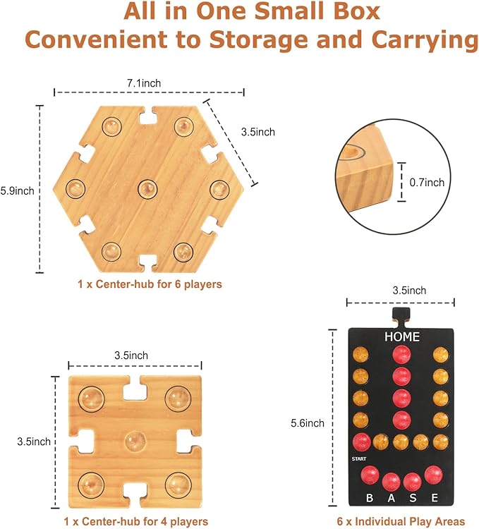 - [Splicing design for easily storing and Carrying] With the unique splicing design, plusvivo marble board game can be easily stored and carried. It is easy to assemble and takes only a few seconds to get a complete marble game board for 4 or 6 players. With a large storage bag, it can be easily disassembled and stored when you finish the game.