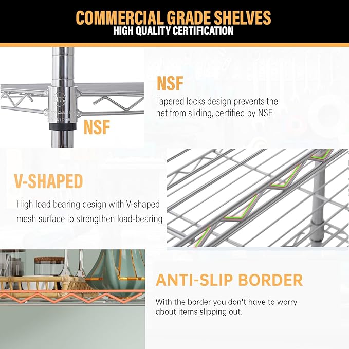 - Durable Material: This shelving unit is constructed from high-quality metal for a strong and reliable structure. Built to last with rust-resistant materials, The storage shelves with v shaped mesh ensure long-term durability. A sturdy and dependable shelving solution for both residential and commercial use.