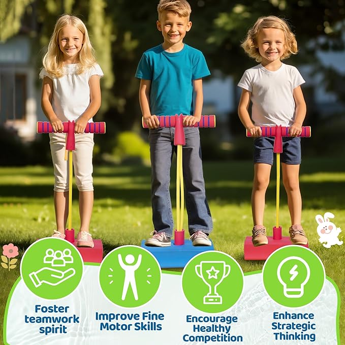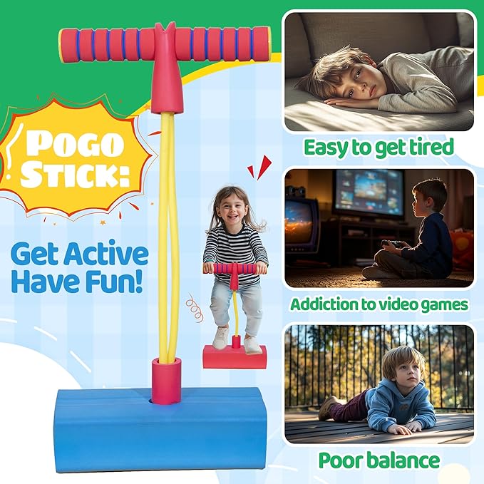 - Foam Pogo Jumper for Kids Fun: The foam pogo stick offers hours of active fun for kids. Made from durable foam, it produces a playful sound with each jump. Ideal for both indoor and outdoor play, this sturdy jumper is designed for kids ages 3 and up. It promotes hand-eye coordination, balance, and gross motor skills, helping children develop important physical abilities. Encourage fitness and get your child moving with this fun jumping toy