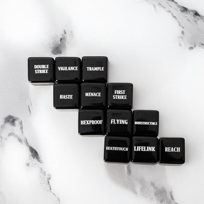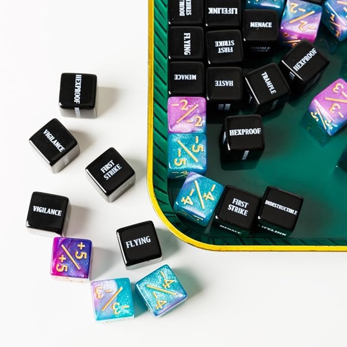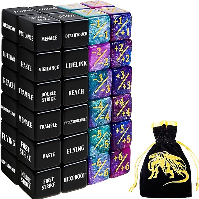 - PACKAGE INCLUDED: 24pcs MTG keywords D6 dices (FIRST STRIKE, VIGILANCE, MENACE, TRAMPLE, HASTE, DOUBLE STRIKE / LIFELINK, REACH, FLYING, HEXPROOF, DEATHTOUCH, INDESTRUCTIBLE) and 12 pieces -1~-6 dice counters & 12 pieces +1~+6 dice counters, a big dice bag