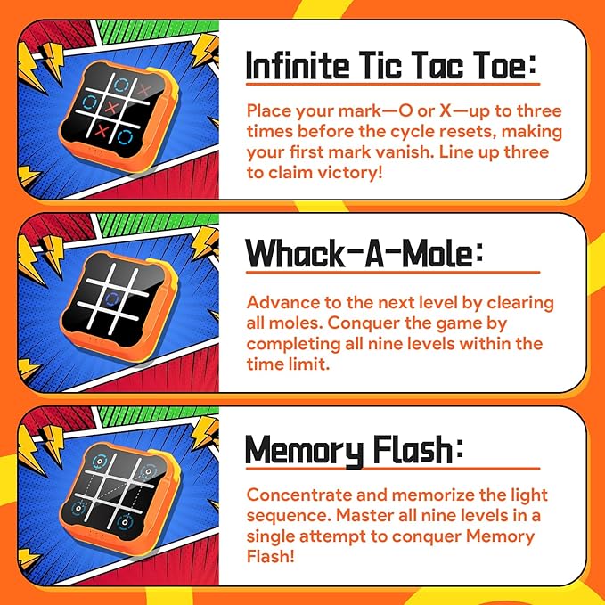 - 【Versatile Gaming Companion】- For road trips with the family, this Tic-Tac-Toe console provides options to play against AI, indulge in endless Tic-Tac-Toe, engage in Whack-A-Mole, or challenge Memory games to while away the journey. When with buddies, switch to a two-player Tic-Tac-Toe duel to determine who has the superior strategy.