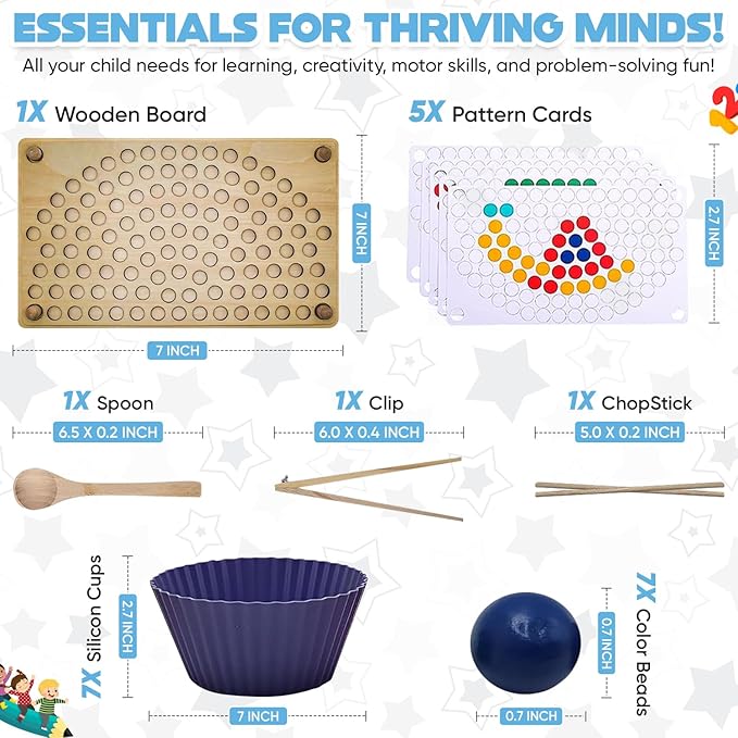 - Includes 10 templates, wooden board, 77 colorful balls, silicone cups, bead clip, spoon, sticks, and sorting board. Ideal for bonding and fun learning with parents and kids.