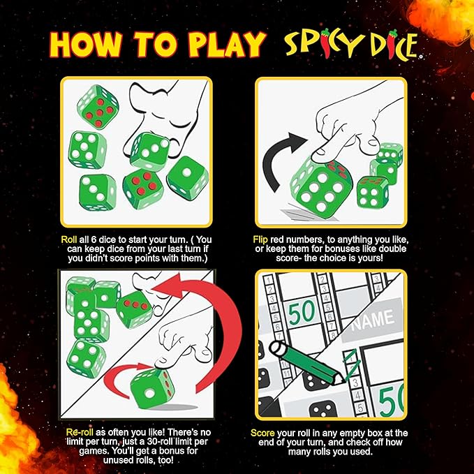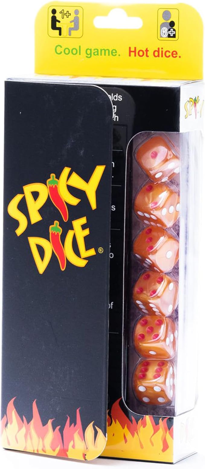 - A Strategic Dice Game with a Fun Twist: Spicy Dice is a fast-paced, engaging dice game featuring 6 deluxe pearlized colored dice. Each die has a unique red-numbered side that can be flipped for strategy or kept for double points. The set includes a scorepad, cheat sheet, rules, and a silkscreened pouch for easy storage.
