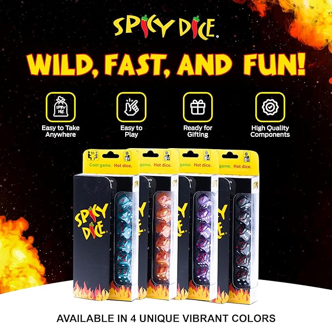 - Why You’ll Love Spicy Dice: Spicy Dice combines strategic gameplay, vibrant colored dice, and portable design. With flexible rolling rules, double-scoring options, and expandable play for larger groups, it keeps everyone engaged and entertained.
