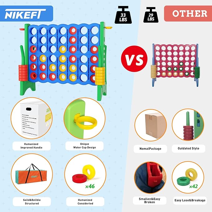 - ๐Bigger is always better: SUPERSIZE YOUR GAME TO SUPERSIZE YOUR FUN!This N1KEFT outdoor or indoor game weighs 33 pounds and measures 47.6โณ L ร 17.7โณ W ร 46โณ H when fully assembled.Gather around your friends to entertain any crowd or family.Designed for ages 3 to infinity,itโs a very interesting and exciting gift. No complicated or awkward trying-to-figure-this-game-out eternity of rules in front of everybody. Thanks to that, family game nights can be more exciting and enjoyable.