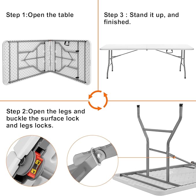 - ✅【Fold-in-half Design】: This folding table 8ft can be open and folded from the center in a few seconds. It has side safety buckle and retractable legs. So its biggest advantage is that it is convenient for people to use and carry indoors or outdoors. Weight Capacity: 330 lbs. The opening size: 95"(L) x 29.7"(W) x 29.3"(H);