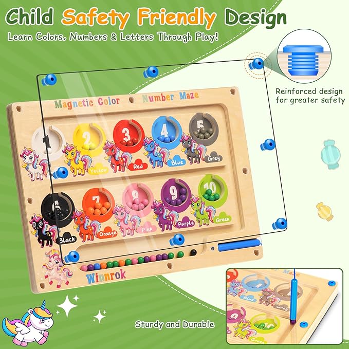 - Safe & Child-Friendly Design: This magnetic puzzles board is made of extra-thick natural wood with non-toxic paints, specially treated smooth rounded edge corners, and a smooth acrylic surface to ensure your child won't scratch. The magnetic number and color maze broad surface is secured with 8 pins to ensure that the beads will not fall out and be swallowed by your child by mistake! The magnetic pen has appropriate magnetic power attached to the board and beads