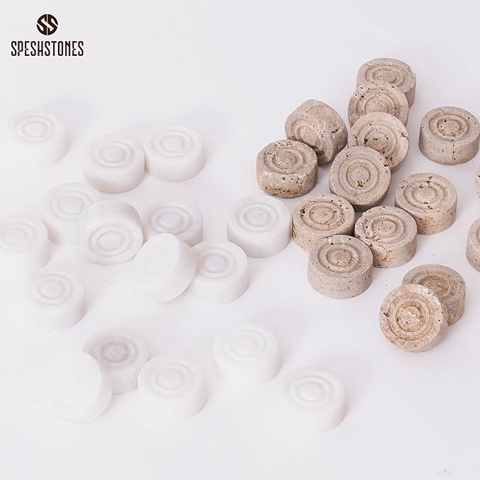 - MATERIAL - Handcrafted from natural travertine and marble, these stone checker pieces offer timeless style and durability. Perfect for indoor and outdoor games, game tables, and elegant board games setups.
