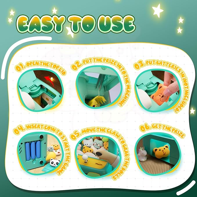 - 【Easy to Use & Adjustable to SilentEnglish】 In addition to music, sound, and volume control, the claw is flexible and powerful, able to rotate 360 degrees and easily select prizes, providing countless hours of entertainment for children.