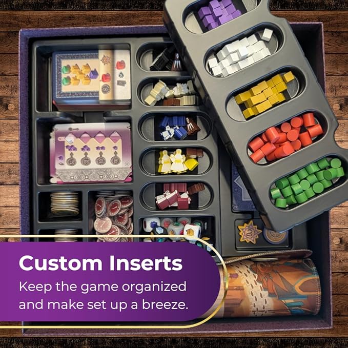 - Top-shelf components and amazing table presence. Over 150 custom wood pieces, 15 jumbo silkscreened dice, waterproof PVC player mats, a custom storage insert, and a 12” x 36” double-sided neoprene playmat.