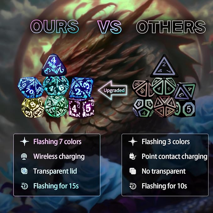 - Wireless Charging Dice: The RGB dice feature an upgraded wireless charging design, eliminating charging issues(point contact charging) associated with traditional LED dice. The built-in charging coil of this dnd dice allows for easy wireless charging