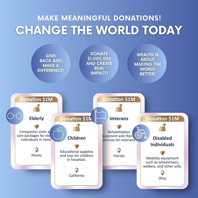 - GIVE BACK & CREATE A BETTER WORLD Discover the joy of giving! This financial literacy game teaches the value of charitable donations and supporting causes that matter. Make a lasting impact while mastering money management, strategy, and generosity.