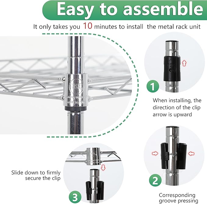 - Easy and Quick Assembly: With simple instructions and a user-friendly design, this wire shelving can be assembled quickly without the need for complicated tools. Spend less time setting up and more time organizing your space. Enjoy a hassle-free installation process with a sturdy and functional shelf in no time.