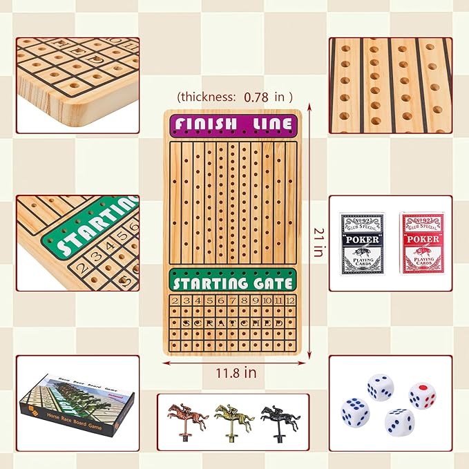 - ๐ PREMIUM COMPONENTS - Includes 6 detailed metal racehorses, 52 illustrated playing cards, 2 specialty wooden dice, and a vibrant 21"x11.8" racetrack board. Durable storage box ensures long-lasting replay value.